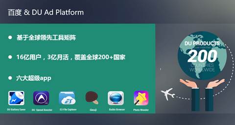 蒋能学用百度自身的例子证明了百度DAP的真正实力:“DU Battery Saver是一款桌面工具类产品,在接入DAP后收入上涨了152%,是原来的2.52倍;ES File Explorer 是传输工具,在接入海外两家主流平台后,收入上涨了51%。”虽然有百度在为应用持续“输血”,但百度海外的产品矩阵大部分都已经实现了高效的流量变现。“百度DAP平台除了能够提升产品的填充率和RPM,还能够提升联通率。由于世界各国的网络环境不一,以印度和印尼为例,服务器如果放在美国,每连接100次,就有80次成功,20次失败,广告不断跳转,这一跳就会丧失20%的流量变现。”百度在本地化方面也做足了准备,除了在世界各地建立机房之外(新加坡机房覆盖印尼、英国机房覆盖欧洲、埃及机房覆盖中东等),还在世界各地设有办公室,并且90%以上都是本地员工。以强大技术+本地员工的组合,更好的为百度DAP海外本地开发者提供服务。